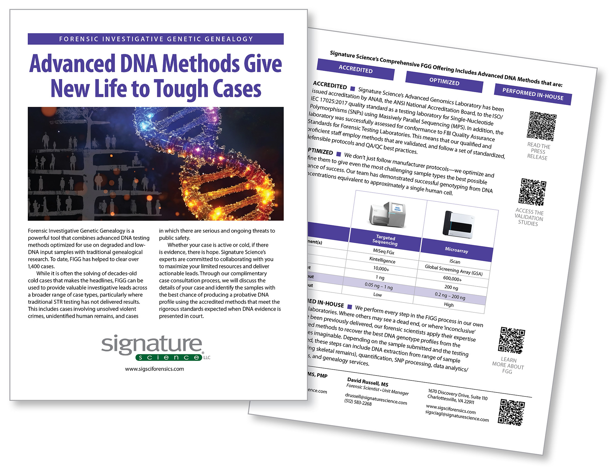 At Signature Science, we perform the DNA genotyping in our own lab – we do not outsource this crucial first step! Why? Because where others may see a dead end, our forensic scientists use their expertise to get the best DNA genotype profiles possible from the worst samples imaginable. Our validated lab methods can provide investigative leads from DNA inputs 1000x lower than industry standards, giving you the best shot at solving your case. The quantity and quality of your DNA sample determines your testing options. Our team can recommend which of your case samples are best for genotyping and which method has the greatest chance for success.
